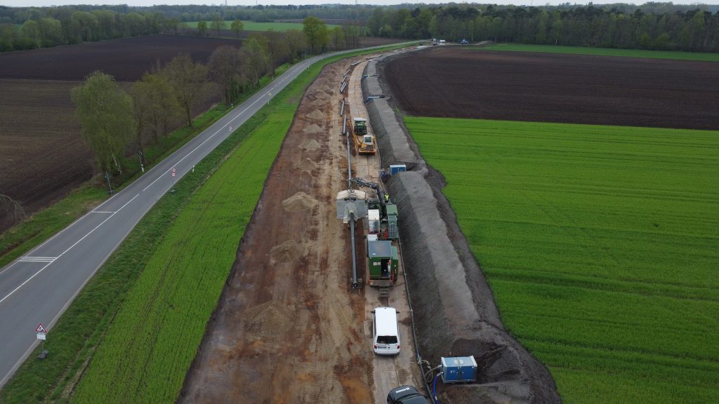 Die Bauarbeiten für die Wasserstoffleitung Heek – Epe (HEp) schreiten zügig voran. Nach dem erfolgreichen Abtrag des Mutterbodens haben nun die Schweißarbeiten an den Rohren begonnen.